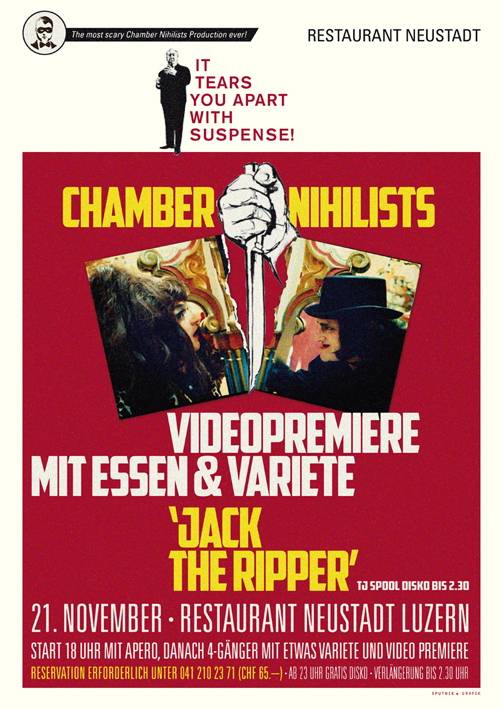 Es ist soweit: «Jack The Ripper» hat im letzten Winter sein Unwesen im Luzernischen getrieben. Die Chamber Nihilists haben trotz eisigem Wind bei Nacht und Nebel sein Treiben gefilmt. Nun ist das Video zum Song fertig und wird im Restaurant Neustadt Première feiern. Die Filmemacher Thomas Horat (Regie) und Luzius Wespe (Kamera) bescheren uns damit ein Vergnügen der besonderen Art. Gut möglich, dass euch das Essen im Halse stecken bleibt. Mehr wird an dieser Stelle nicht verraten.